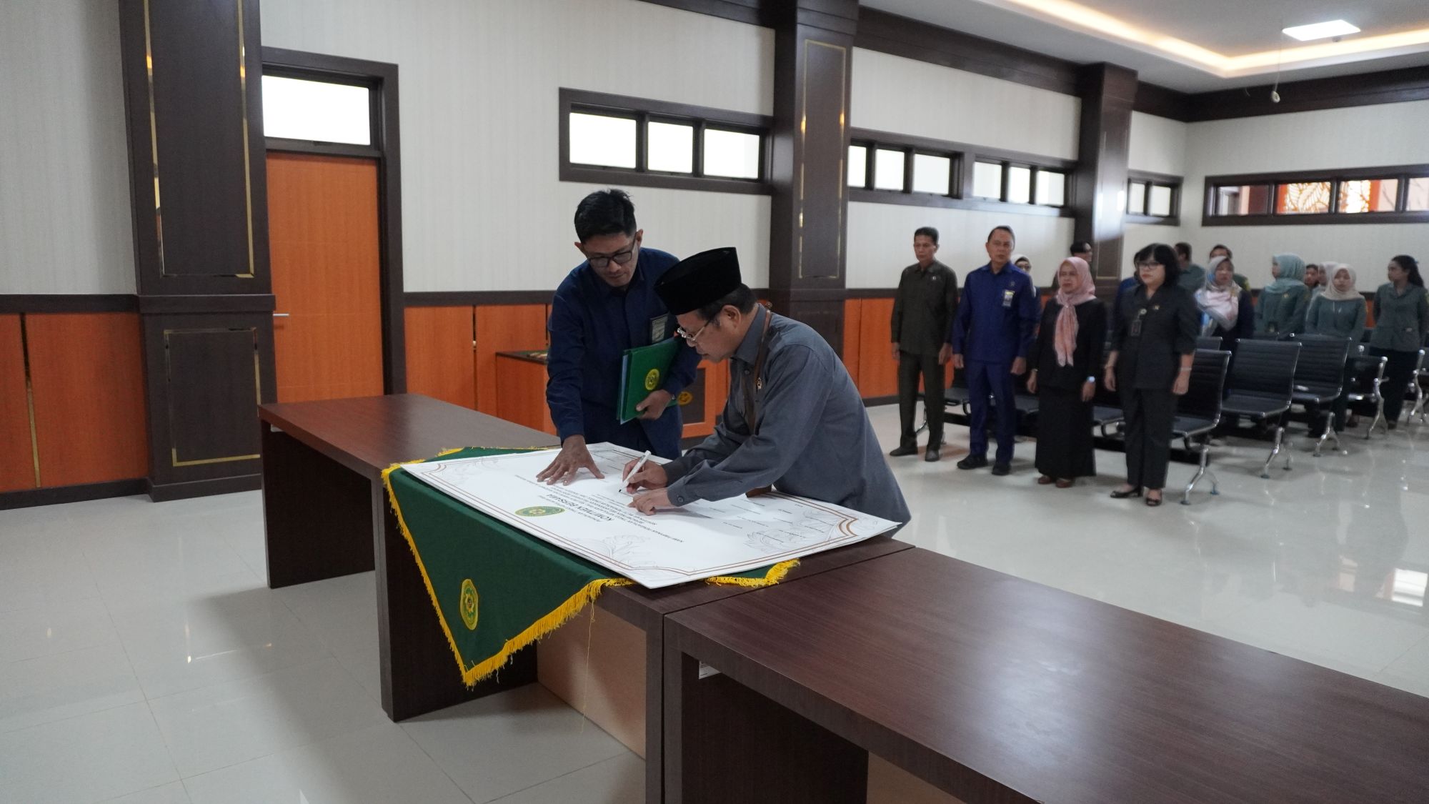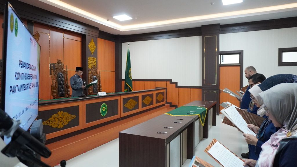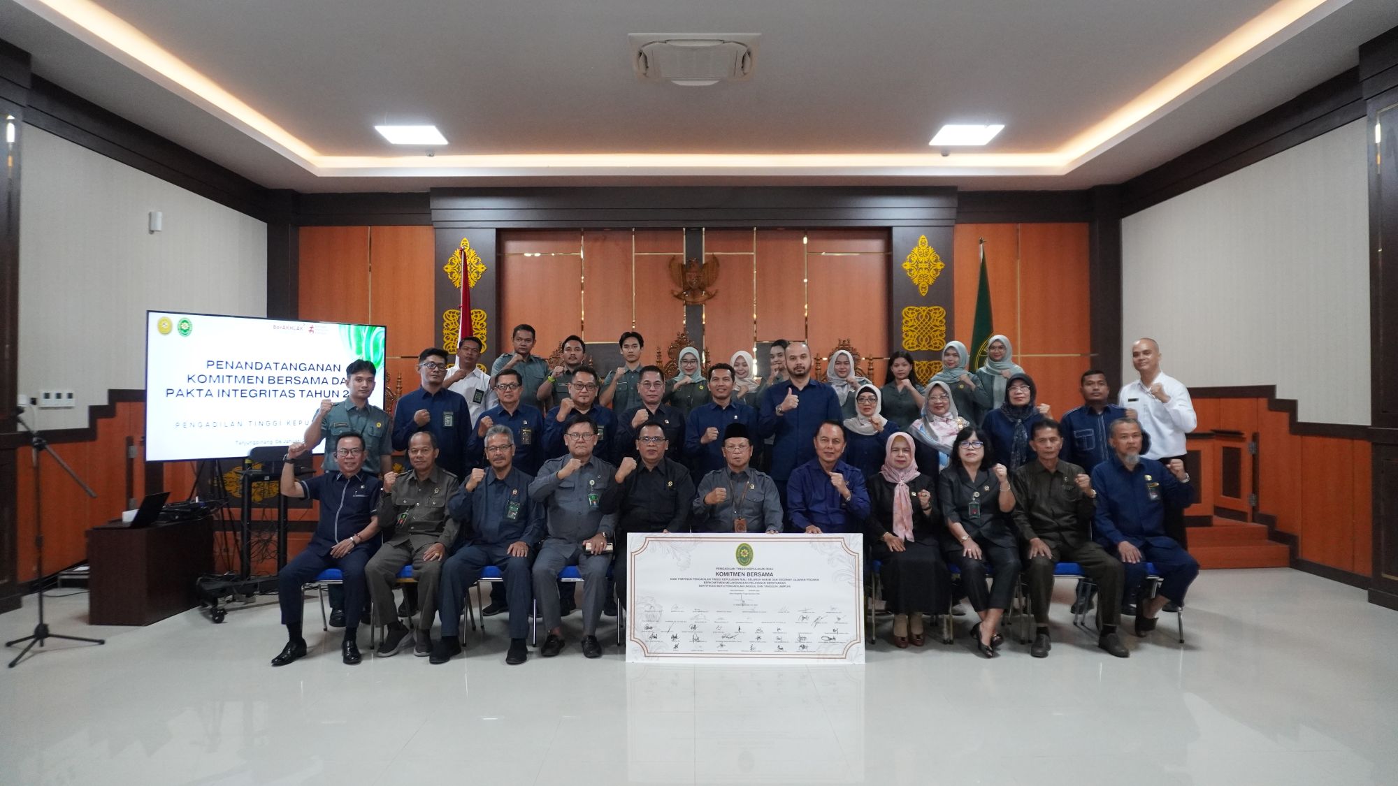 Acara Penandatanganan Pakta Integritas dan Komitmen Bersama Hakim Tinggi dan Pegawai Pengadilan Tinggi Kepulauan Riau Tahun 2026 dilaksanakan di Ruang Sidang Utaman Pengadilan Tinggi Kepulauan Riau. Kegiatan ini merupakan wujud komitmen seluruh aparatur dalam menegakkan integritas, profesionalisme, serta akuntabilitas dalam pelaksanaan tugas dan fungsi peradilan. Melalui penandatanganan Pakta Integritas dan Komitmen Bersama ini, Hakim Tinggi dan Pegawai Pengadilan Tinggi Kepulauan Riau menegaskan tekad untuk menjunjung tinggi nilai-nilai kejujuran, transparansi, dan pelayanan prima, serta mendukung terwujudnya peradilan yang bersih, berwibawa, dan berintegritas.