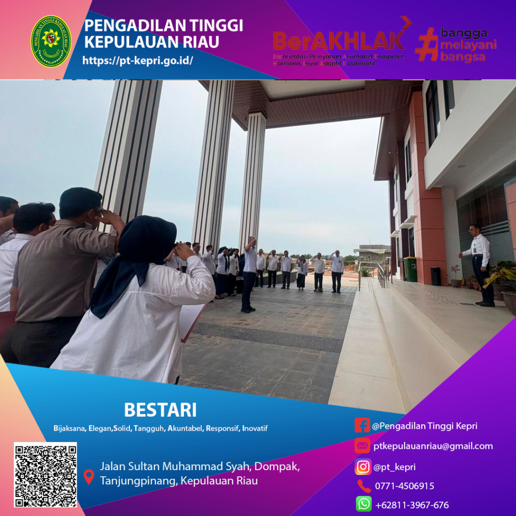 Keluarga besar Pengadilan Tinggi Kepulauan Riau melaksanakan apel pagi di gedung baru yang berlokasi di Dompak, Tanjungpinang. Apel dihadiri oleh Ketua Pengadilan Tinggi Kepulauan Riau dan diikuti oleh para Hakim Tinggi, Panitera, Sekretaris, pejabat struktural dan fungsional, serta seluruh aparatur Pengadilan Tinggi Kepulauan Riau. Kegiatan apel pagi ini berlangsung dengan tertib dan khidmat sebagai bentuk disiplin serta semangat kebersamaan seluruh aparatur dalam mendukung pelaksanaan tugas dan pelayanan peradilan di lingkungan Pengadilan Tinggi Kepulauan Riau.