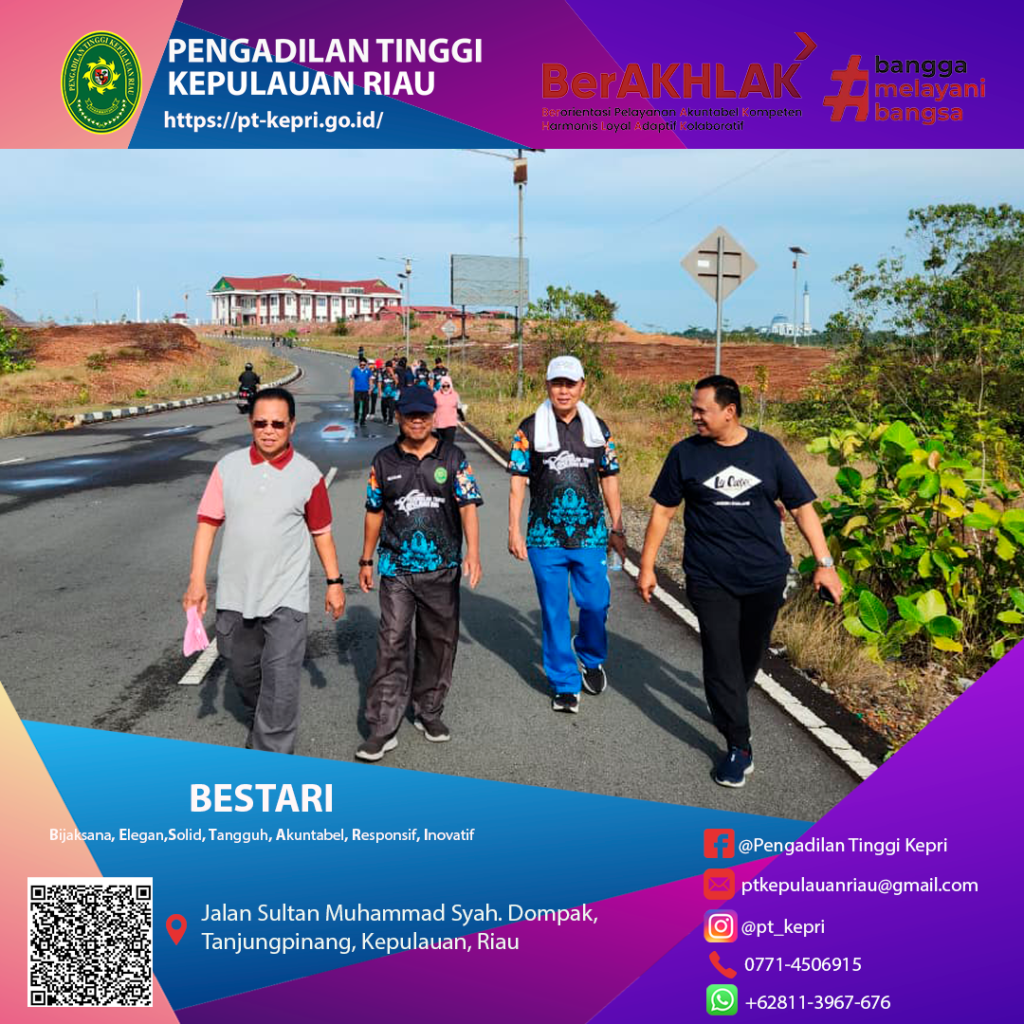 Kegiatan jalan santai dan bermain voli bersama digelar pada Jumat, 7 November 2025, yang diikuti oleh seluruh keluarga besar Pengadilan Tinggi Kepulauan Riau. Jalan santai dimulai dengan rute mengelilingi Pulau Dompak, menghadirkan suasana segar dan penuh kebersamaan. Usai kegiatan tersebut, peserta melanjutkan dengan pertandingan voli persahabatan di lapangan voli Pengadilan Tinggi Kepulauan Riau. Kegiatan ini menjadi ajang mempererat silaturahmi, meningkatkan kebugaran, serta memperkuat soliditas antarpegawai dalam suasana yang hangat dan penuh semangat.