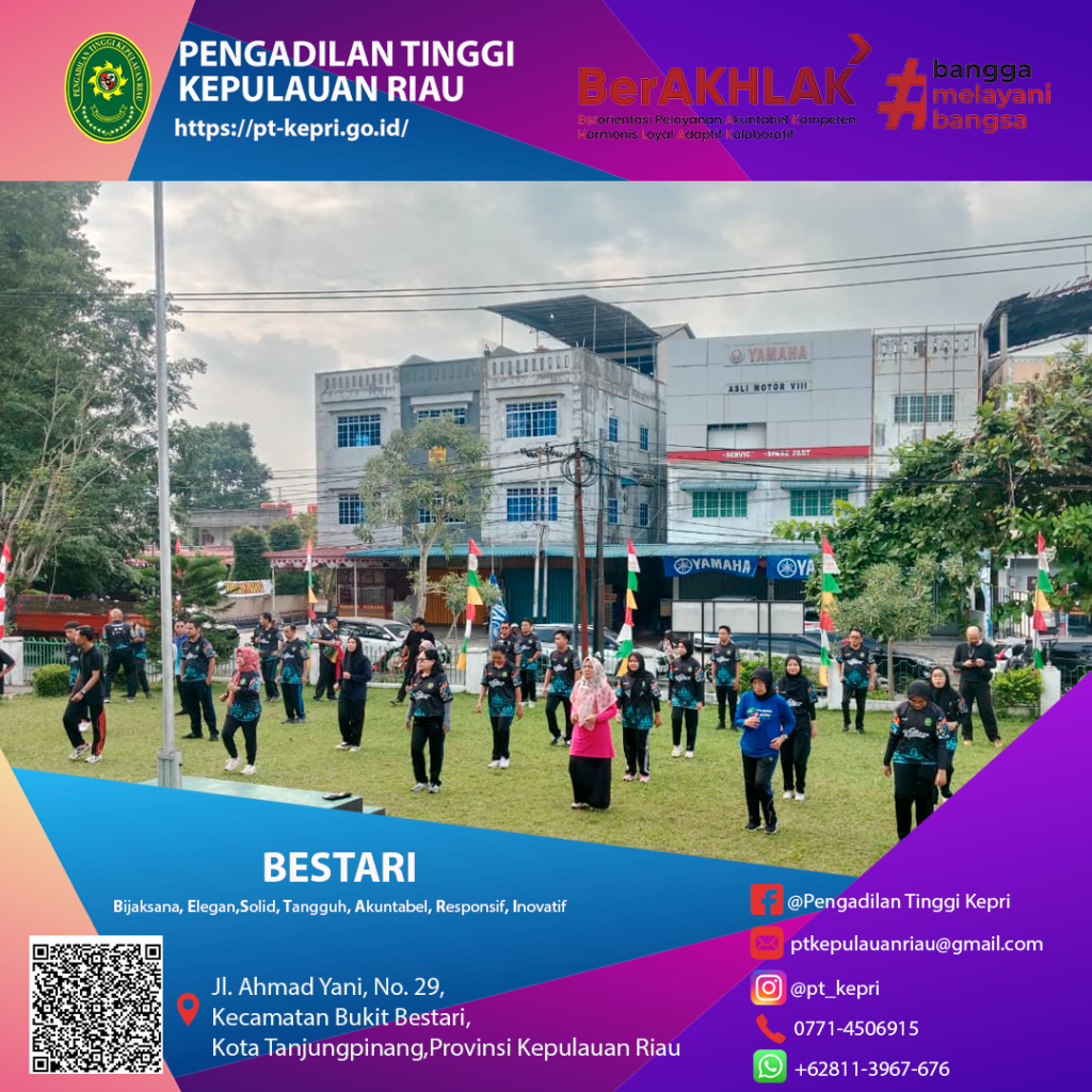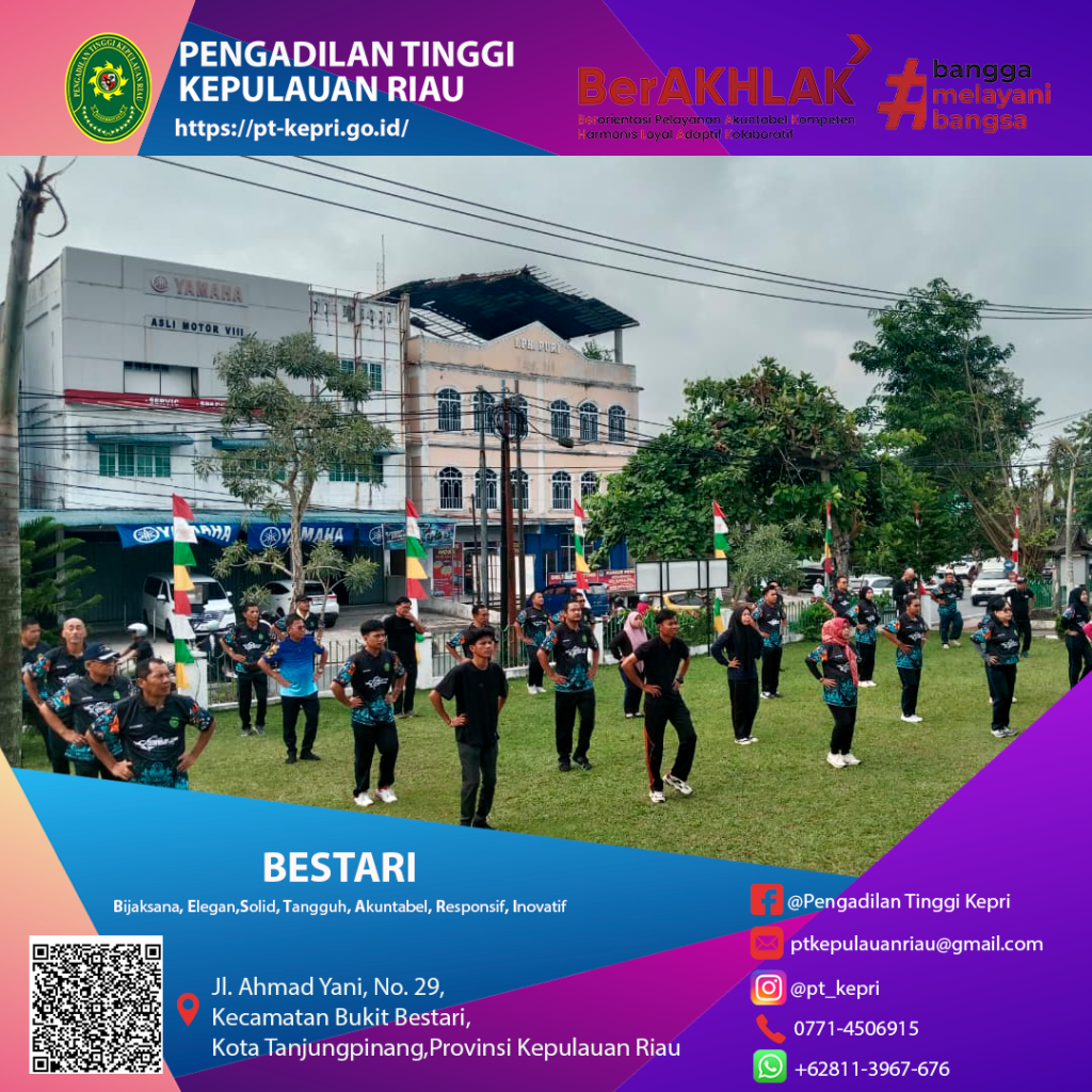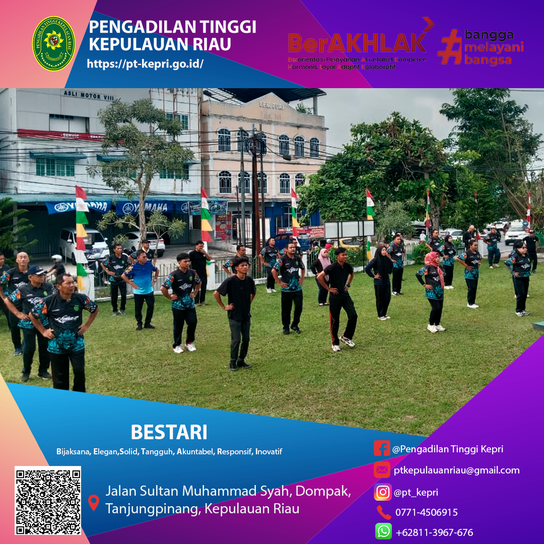 Pengadilan Tinggi Kepulauan Riau melaksanakan kegiatan senam pagi bersama di halaman kantor sebagai upaya menjaga kebugaran jasmani sekaligus mempererat kebersamaan antarpegawai. Kegiatan yang diikuti oleh seluruh aparatur, mulai dari pimpinan, hakim, pejabat struktural dan fungsional hingga tenaga honorer ini berlangsung dengan penuh semangat dan antusiasme. Melalui kegiatan tersebut, diharapkan seluruh pegawai dapat menjaga kesehatan serta meningkatkan semangat kerja dalam memberikan pelayanan terbaik kepada masyarakat.