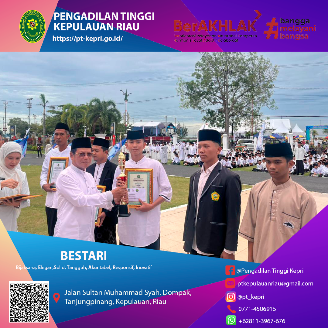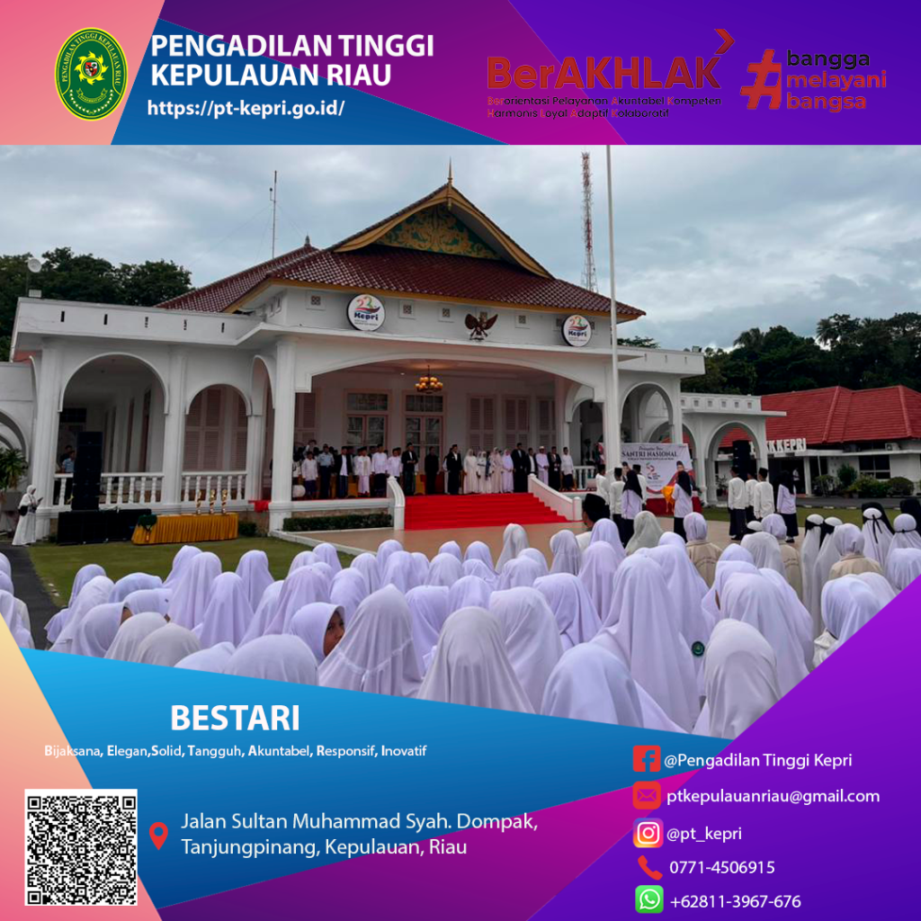Pada Rabu, 22 Oktober 2025 YM Ketua Pengadilan Tinggi Kepulauan Riau menghadiri Kegiatan Upacara Peringatan Hari santri Nasional yang berlangsung khidmat di Gedung Daerah, Tanjungpinang. Kegiatan ini menjadi momentum penting untuk meneguhkan peran santri dalam merawat nilai-nilai kebangsaan serta memperkuat kontribusi dunia pesantren bagi pembangunan daerah. Dalam suasana penuh kekhidmatan, peserta upacara yang terdiri dari para santri, tokoh agama, dan unsur forkopimda mengikuti rangkaian kegiatan dengan penuh antusias.