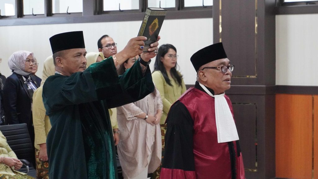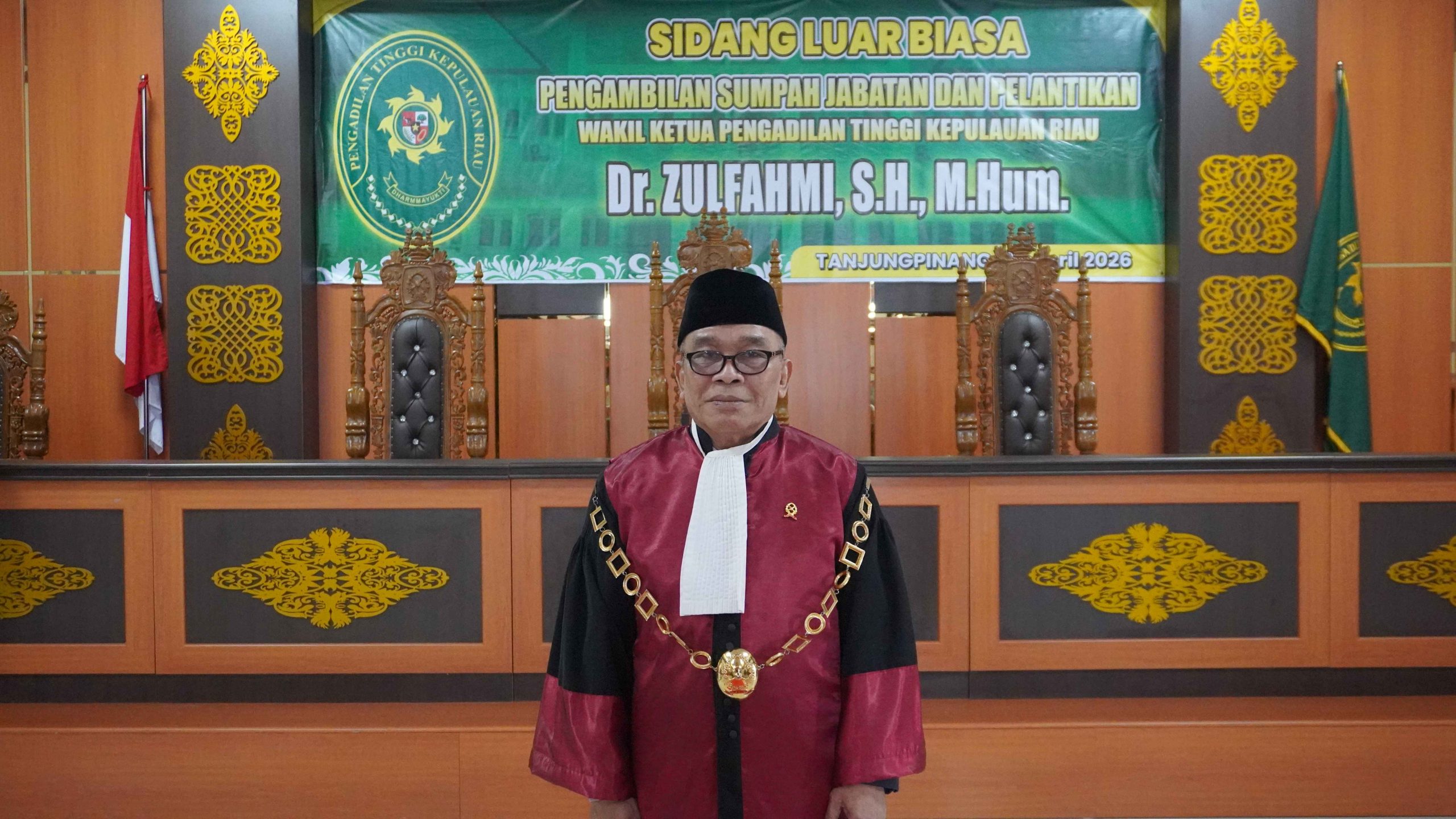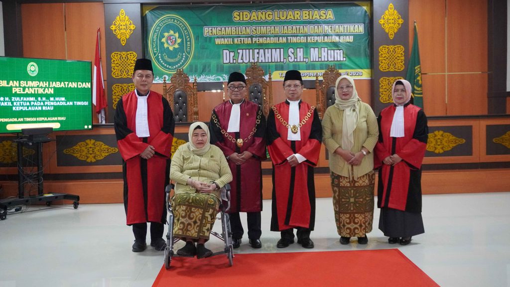 Pengadilan Tinggi Kepulauan Riau melaksanakan kegiatan pengambilan sumpah jabatan dan pelantikan Wakil Ketua Pengadilan Tinggi Kepulauan Riau, Bapak Dr. Zulfahmi, S.H., M.Hum., pada Kamis, 2 April 2026 bertempat di Ruang Sidang Utama Pengadilan Tinggi Kepulauan Riau. Kegiatan ini dipimpin langsung oleh Ketua Pengadilan Tinggi Kepulauan Riau dan dihadiri oleh para Hakim Tinggi, Ketua Pengadilan Negeri Batam, Ketua Pengadilan Negeri Tanjungpinang, Panitera Pengadilan Negeri Tanjung Balai Karimun, Wakil Ketua Pengadilan Negeri Tanjungpinang, serta tamu undangan lainnya.