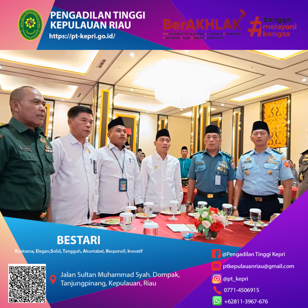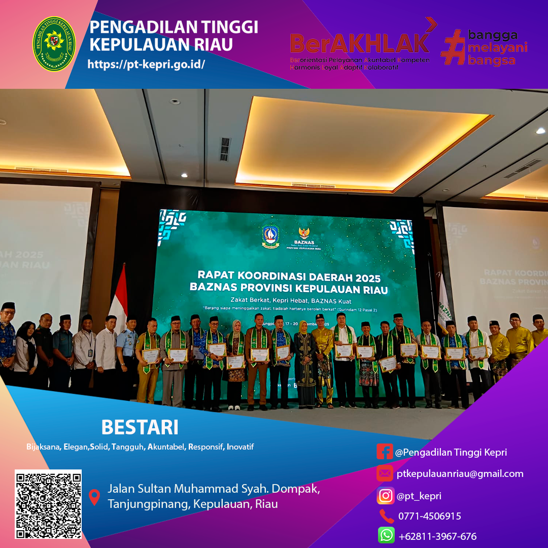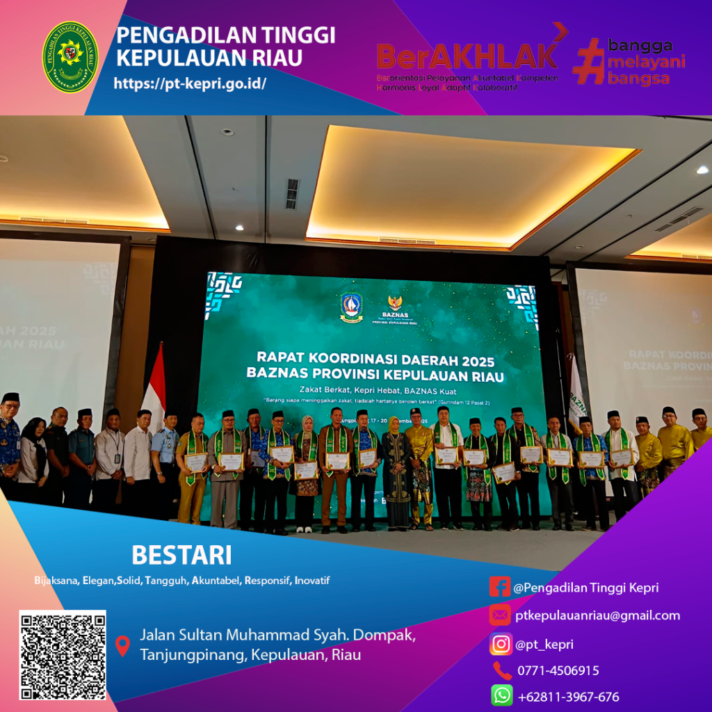 Kegiatan Rapat Koordinasi BAZNAS Provinsi Kepulauan Riau pada Senin, 17 November 2025, berlangsung di Trans Convention Centre Tanjungpinang dengan menghadirkan para pemangku kepentingan dari berbagai instansi. Pengadilan Tinggi Kepulauan Riau turut hadir melalui perwakilan KASUB TURT, Bapak Riko Arianto, S.H., yang mengikuti jalannya rapat sebagai bentuk dukungan terhadap upaya penguatan tata kelola dan optimalisasi pengelolaan zakat di wilayah Kepulauan Riau.