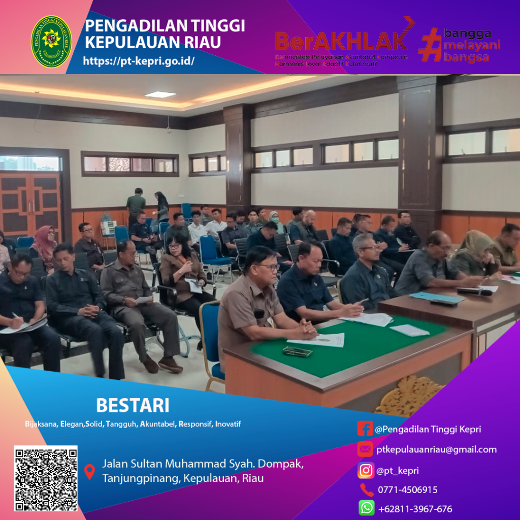 Pengadilan Tinggi Kepulauan Riau menggelar Rapat Pleno Evaluasi Kinerja Pegawai yang dipimpin langsung oleh Ketua Pengadilan Tinggi, bertujuan meninjau capaian kerja, disiplin, dan kualitas pelayanan pegawai selama periode tersebut. Dalam rapat tersebut, disampaikan peningkatan realisasi output unit kerja, beberapa kendala administratif seperti keterlambatan laporan, serta kebutuhan peningkatan kompetensi melalui pelatihan dan bimbingan teknis. Diskusi pun menghasilkan langkah-langkah perbaikan, termasuk penertiban jadwal pelaporan, optimalisasi sistem informasi kinerja, dan pembentukan tim monitoring, dengan harapan evaluasi bulanan ini dapat mendorong profesionalisme dan produktivitas pegawai secara berkelanjutan di lingkungan Pengadilan Tinggi Kepulauan Riau.