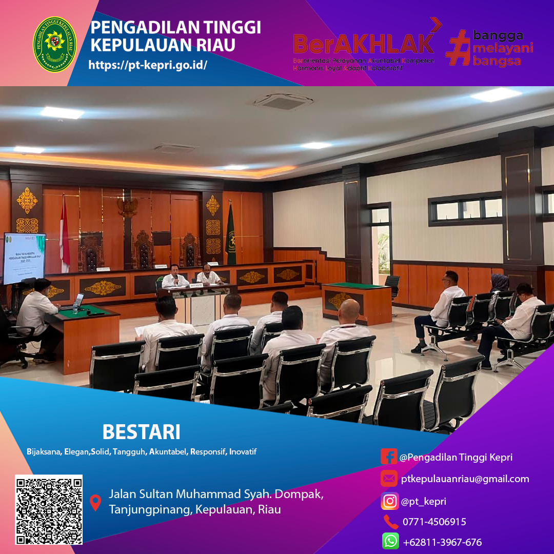 Rapat Reviu Renstra Pengadilan Tinggi Kepulauan Riau periode 2025–2029 pada hari Senin, 24 November 2025, berlangsung di Ruang Sidang Utama Pengadilan Tinggi Kepulauan Riau. Kegiatan ini dilaksanakan sebagai langkah strategis dalam memastikan keselarasan arah kebijakan, sasaran, serta rencana program Pengadilan Tinggi Kepulauan Riau selama lima tahun ke depan.